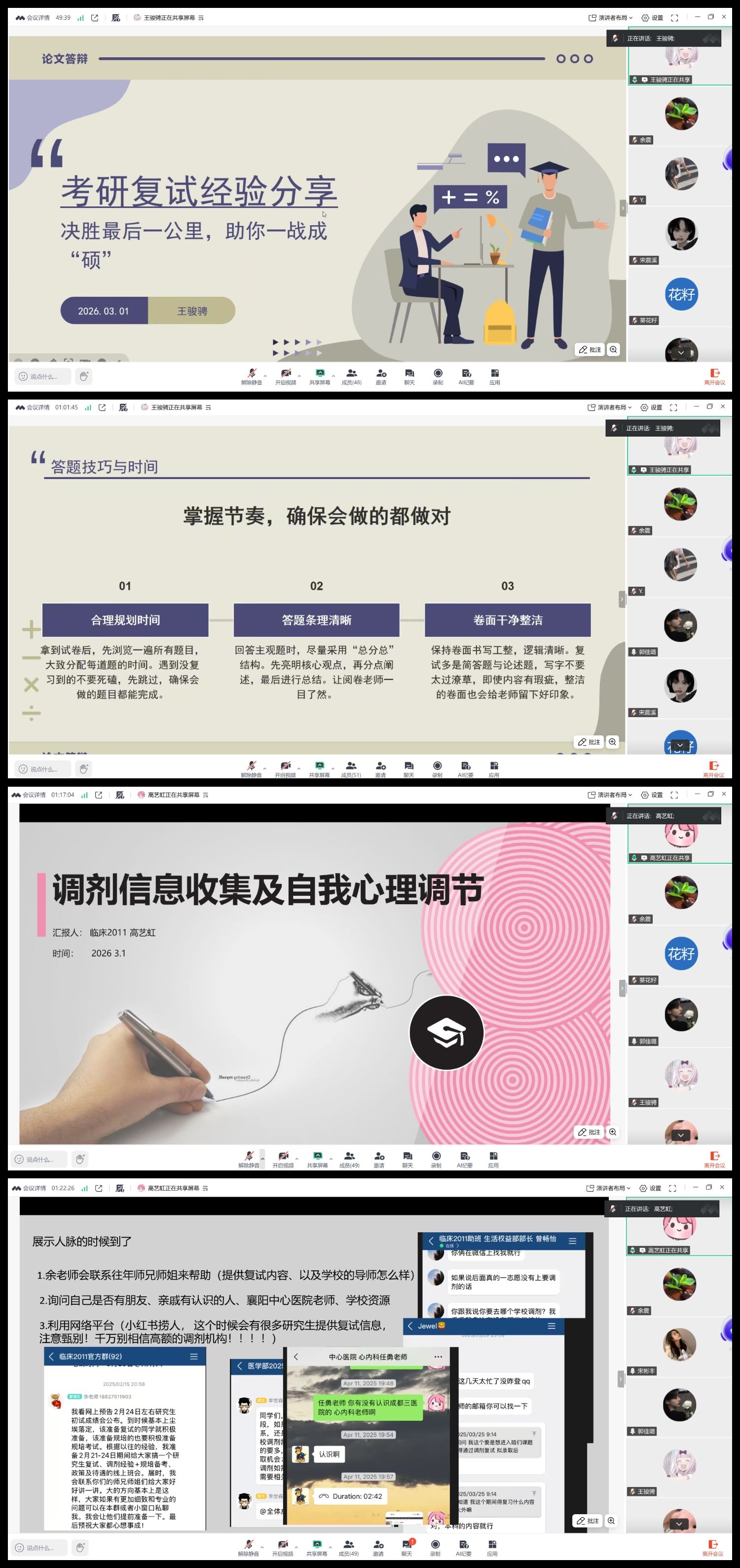 讲座现场,三位在读研究生结合自身复试经历,从不同维度为学子们提供精准指导。武汉科技大学在读研究生郭佳璐梳理复试全流程,详细讲解简历、自荐信的撰写技巧,分享了联系导师及师兄师姐的实用方法,帮助学子们做好复试前期准备。南昌大学在读研究生王骏骋聚焦复试核心考核环节,针对英语笔试、英语口语、专业课复习给出具体策略,同时拆解操作技能考试和面试的重点难点,传授临场应答技巧,助力学子提升综合应试能力。西南交通大学在读研究生高艺虹则围绕调剂信息收集展开分享,介绍了各类调剂渠道的使用方法,并结合自身经历讲解复试期间心理调节技巧,引导学子们以积极心态应对备考挑战。