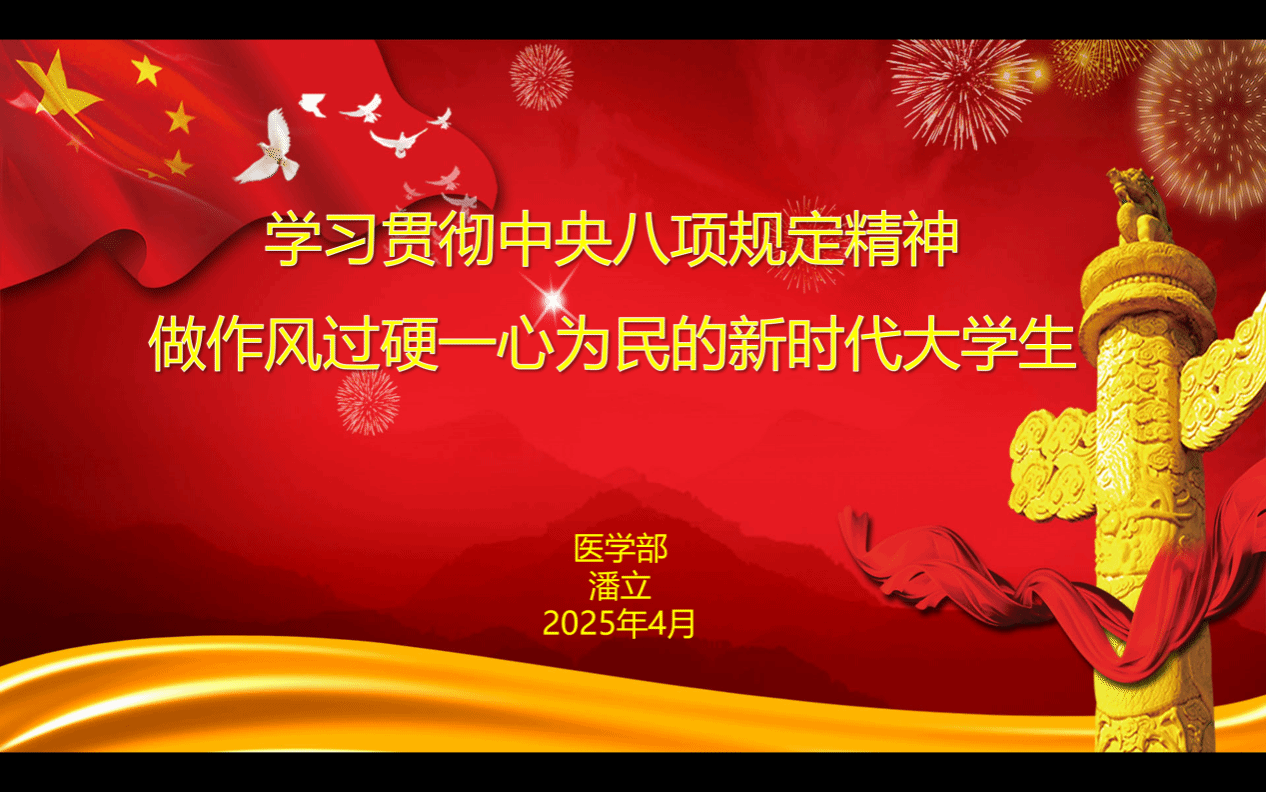 此次专题党课,进一步增强了医学部全体学生党员对中央八项规定精神的理解与认识,强化了纪律意识和规矩意识。大家纷纷表示,将以此次党课学习为契机,持续改进工作作风,把中央八项规定精神落实到具体行动中,以更加务实的态度、更加扎实的作风对待学业、学生工作、实习实践。