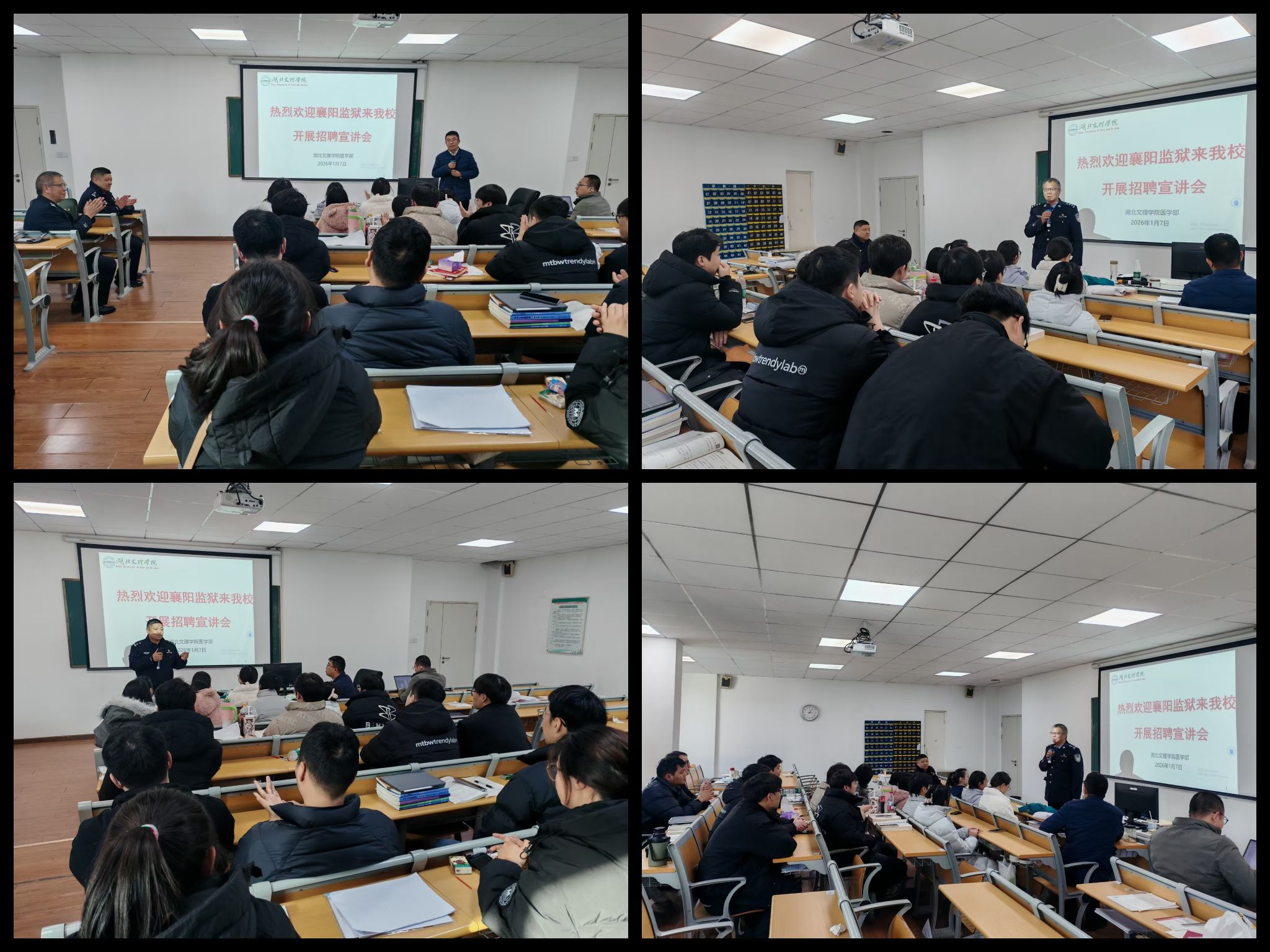 (通讯员 周岩书)1月7日下午14:00,襄阳监狱专场招聘宣讲会暨2026年临床医学专业就业指导会在附属襄阳市中心医院南院区鼓楼巷小区教学楼402教室顺利召开。会议特邀襄阳监狱教育改造科科长周晓溪、医院院长郑峰华、医务办主任余雪晖三位民警出席,医学学工处处长潘立、学工办主任余震、班主任李雨雷参加了会议。